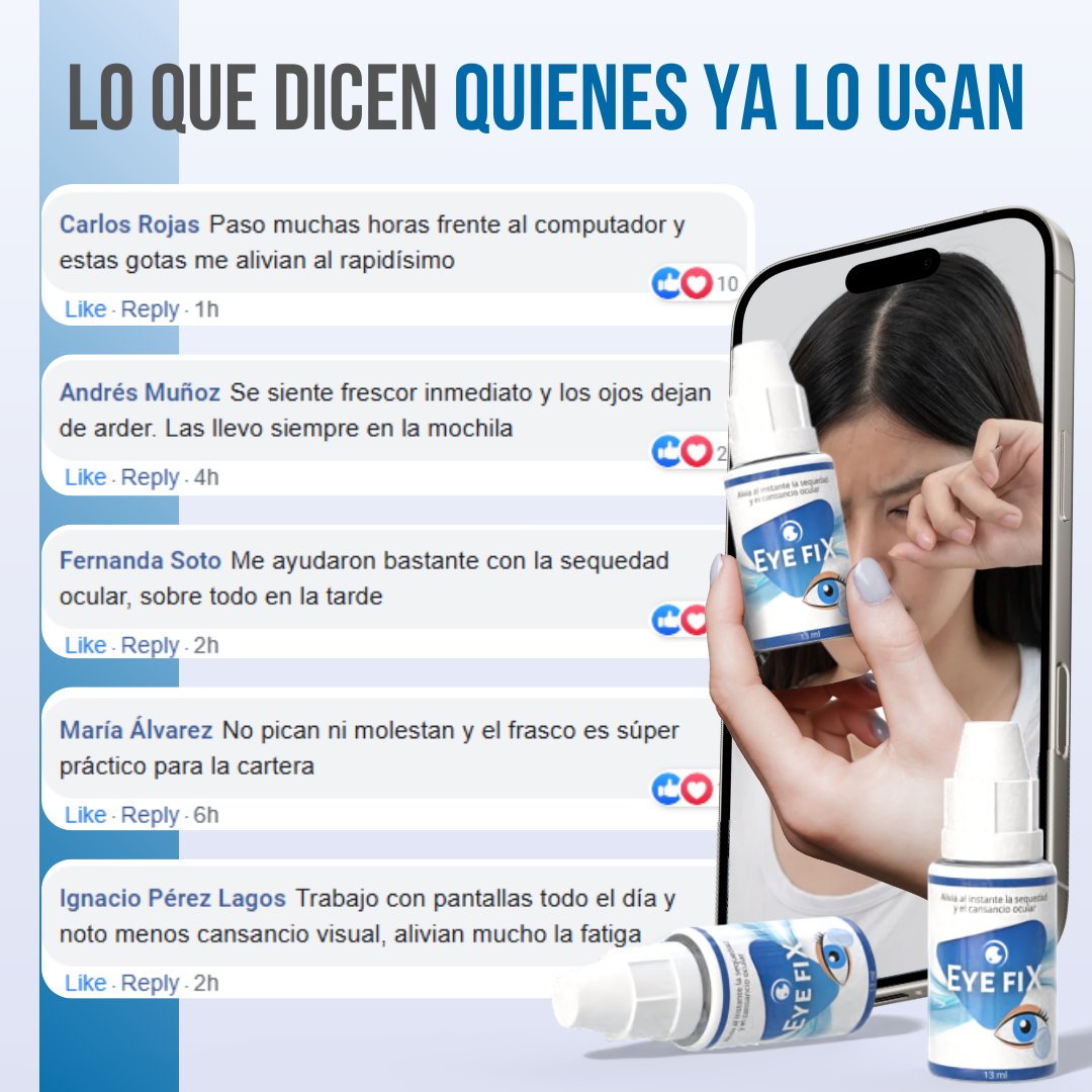 Quienes usan Eye Fix™ destacan su efecto inmediato, facilidad de uso y sensación de alivio real. Muchos la incorporan a su rutina diaria para enfrentar largas jornadas frente al computador o el celular. También valoran su formato pequeño y discreto, ideal para llevar a cualquier parte. La sensación de frescura y comodidad genera confianza desde la primera aplicación. Eye Fix™ se convierte así en un aliado diario para quienes buscan cuidar sus ojos sin complicaciones. Una solución simple, efectiva y bien evaluada por sus usuarios.