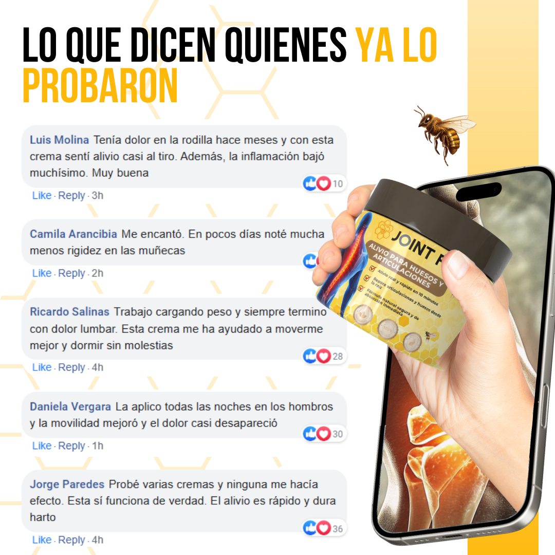 Joint Fix™ combina veneno de abeja, cúrcuma, miel y aceites esenciales para ofrecer un alivio efectivo del dolor articular y óseo. Su fórmula natural ayuda a calmar molestias provocadas por el desgaste diario, sobrecarga física o falta de movilidad. Con el uso constante, contribuye a reducir la sensación de rigidez. Es una alternativa ideal para quienes buscan alivio sin soluciones agresivas. Cuidado diario con ingredientes de origen natural.